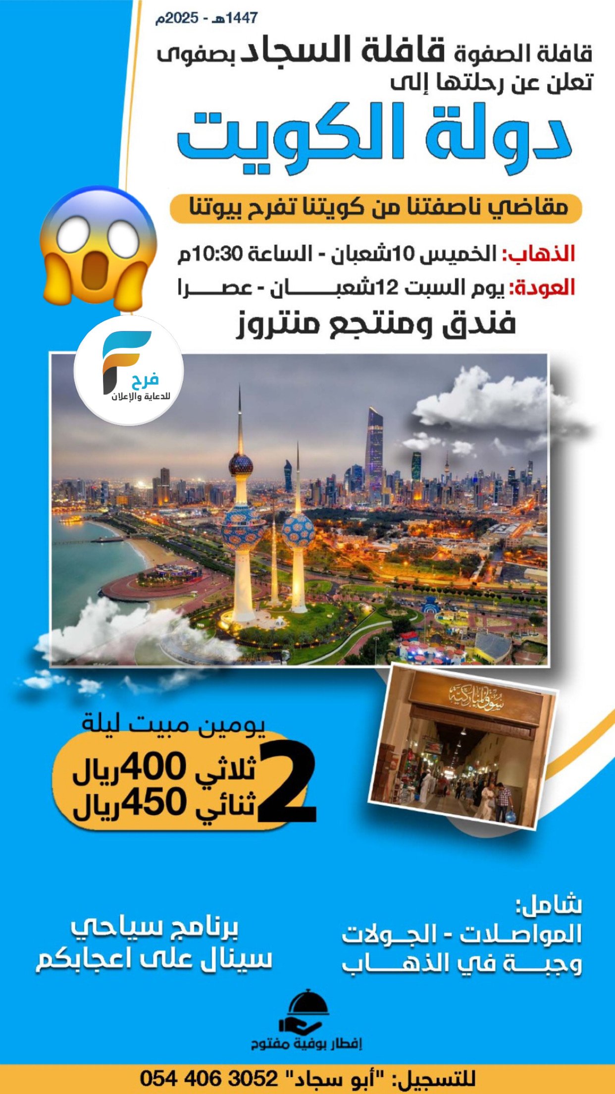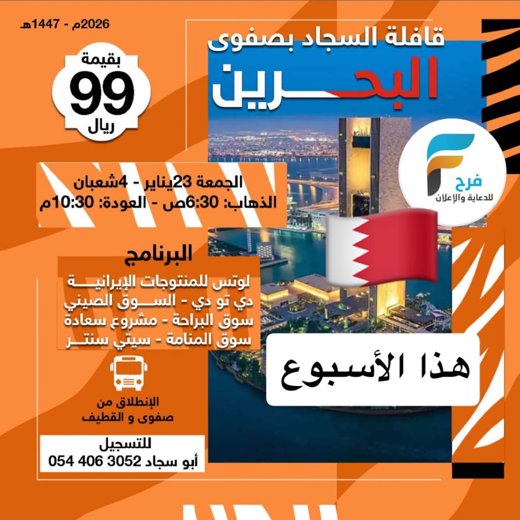 99 ريال تبدأ رحلات قافلة السجاد / البحرين – الكويت 20 يناير، 2026 1 للحجز والإستفسار :- 0544063052 0546506149 أشترك معنا في خدمة فرح :