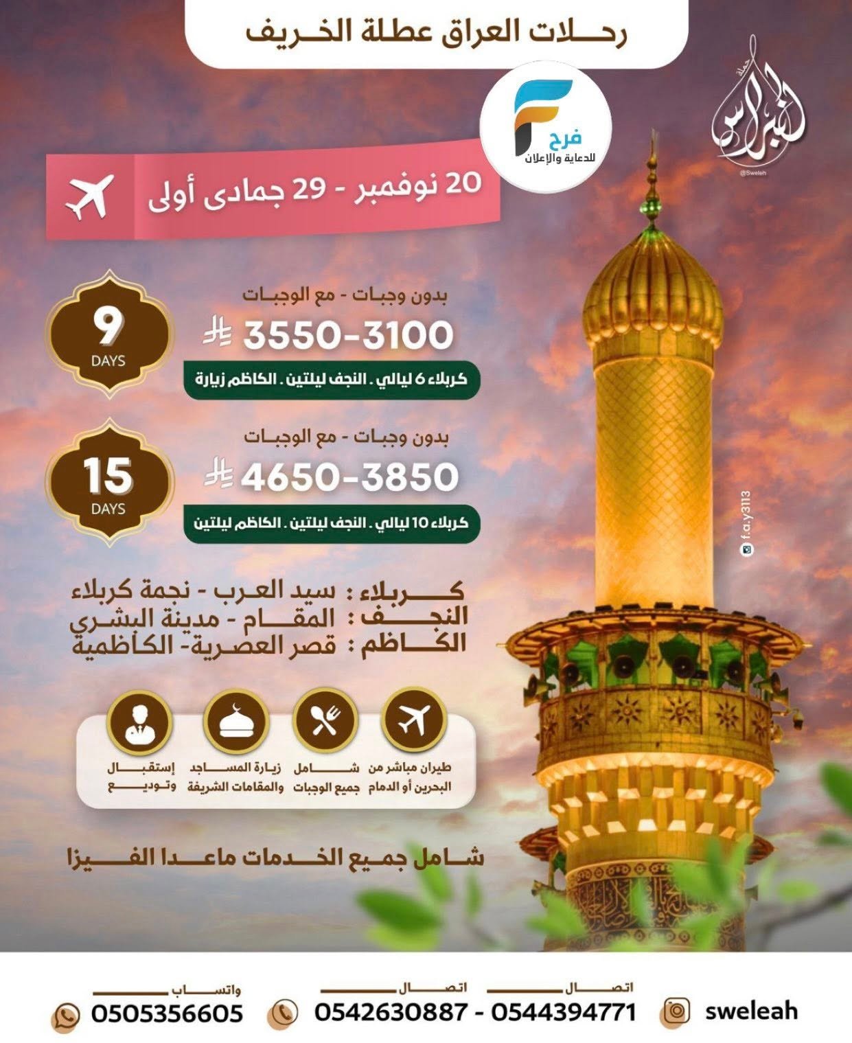 2350 ريال تبدأ رحلات الطيران حملة النبراس / العراق 12 أكتوبر، 2025 لم 1للحجز أو الاستفسار :-054263088705053566050544394771المكتب :-0138551711الانستقرام :https://www.instagram.com/أشترك معنا في خدمة فرح :