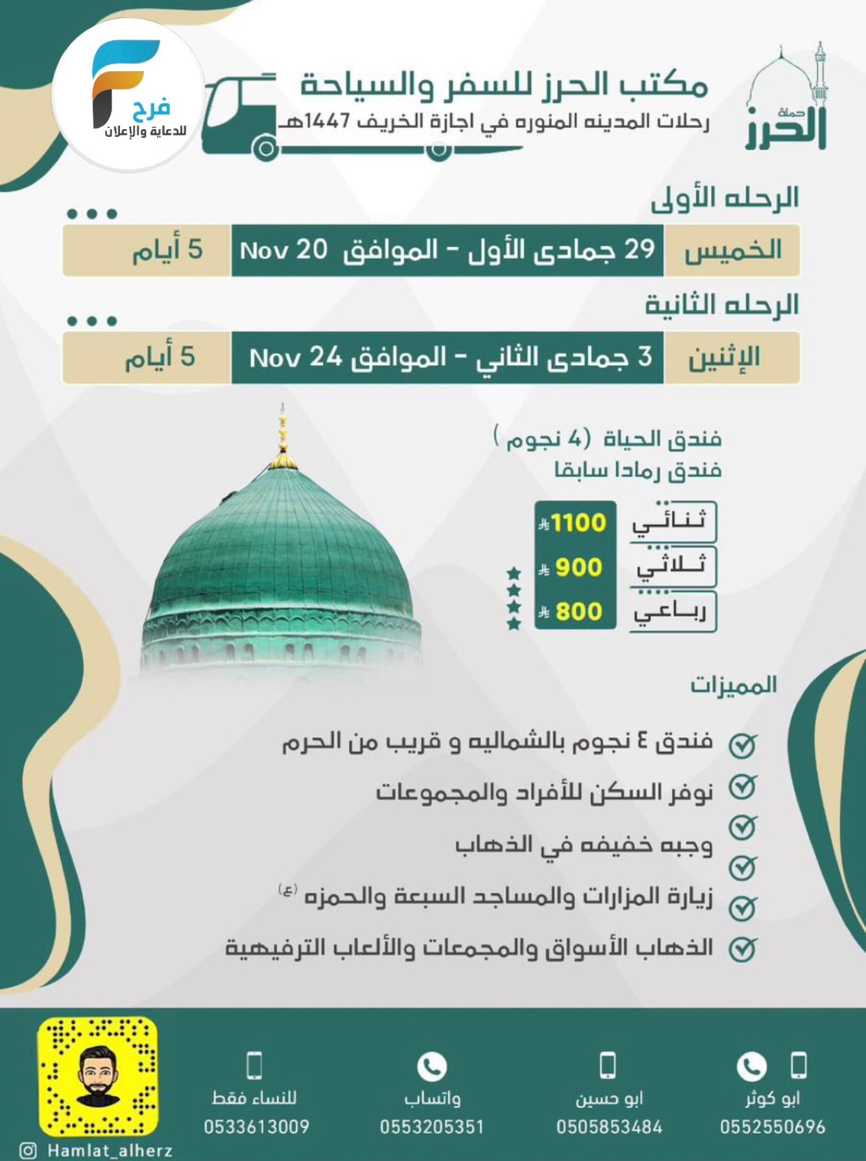 رحلات مكتب الحرز للسفر والسياحة إجازة الخريف / المدينة المنورة 16 نوفمبر، 2025 1 للحجز و للإستفسار : ☎ المكتب / 0138368008 📞 أبو كوثر / 0552550696 📞 أبو حسين / 0505853484 📞 عبدالله محمد/ 0577605665 📲 للنساء / 0533613009 📱واتساب / 0553205351 أو اضغط للمحادثة مباشرة https://goo.gl/tsd4Th أضفني ع سناب شات https://www.snapchat.com موقع المكتب في الخرائط https://goo.gl/maps/ مكتب الحرز للسفر والسياحة أشترك معنا في خدمة فرح : شارك هذا الموضوع: النقر للمشاركة على X (فتح في نافذة جديدة) X انقر للمشاركة على فيسبوك (فتح في نافذة جديدة) فيس بوك معجب بهذه:إعجاب تحميل... مرتبط