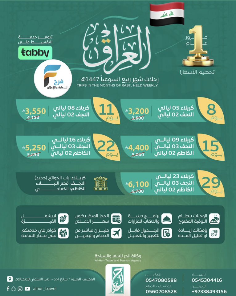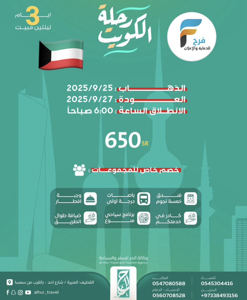 650 ريال تبدأ رحلات وكالة الحر للسفر والسياحة شهر ربيع / الكويت – العراق 18 سبتمبر، 2025 لم 1 للحجز أو الاستفسار : 0547080588 0545304416 0560708528 0097338493156 انستغرام :www.instgram.com سناب :www.snapchat.com أشترك معنا في خدمة فرح : Enter the text or HTML code here شارك هذا الموضوع: النقر للمشاركة على X (فتح في نافذة جديدة) X انقر للمشاركة على فيسبوك (فتح في نافذة جديدة) فيس بوك معجب بهذه:إعجاب تحميل... مرتبط