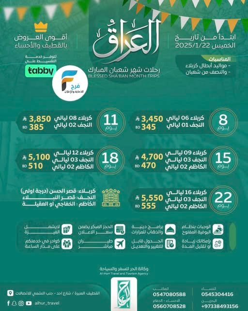 3450 ريال تبدأ رحلات وكالة الحر للسفر والسياحة شهر شعبان / العراق 11 يناير، 2026 1 25/10/01 للحجز أو الاستفسار : 0547080588 0545304416 0560708528 0097338493156 انستغرام : www.instgram.com سناب : www.snapchat.com أشترك معنا في خدمة فرح :