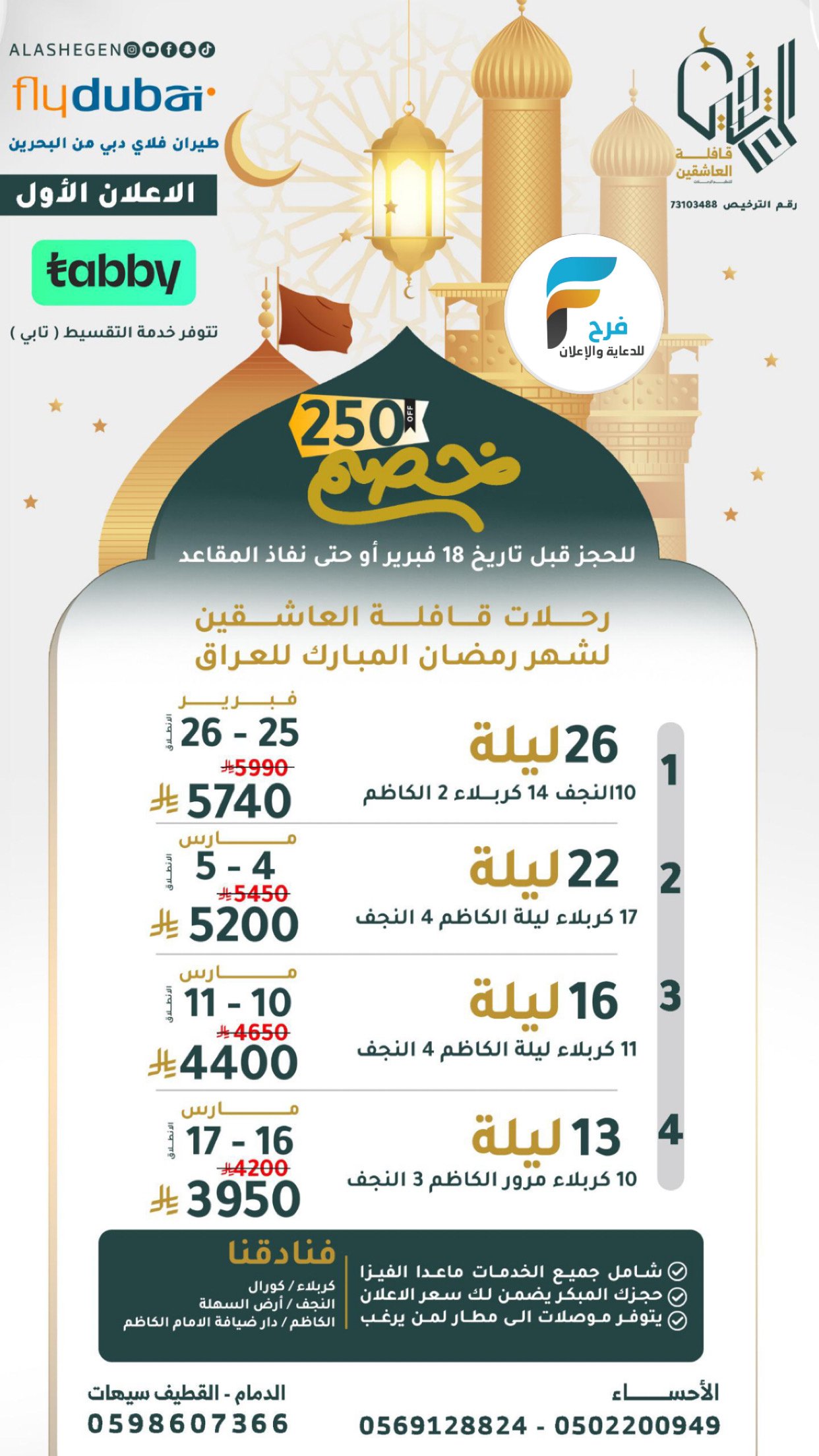 250 ريال خصم رحلات قافلة العاشقين شهر رمضان / العراق 19 فبراير، 20261🔆✨ قنوات قافلة العاشقين ✨🔆حسابات السوشل ميدياhttps://linktr.ee/alasheqenسناب شات :-https://www.snapchat.comالإنستقرام :-https://www.instagram.comاليوتيوب :-https://youtube.comللحجز والاستفسار:-05022009490569128824الدمام والقطيف وسيهات:-0598607366لتصلك إعلاناتنا أحفظ الرقم وأرسل “اشتراك” لـ :0502200949أشترك معنا في خدمة فرح :