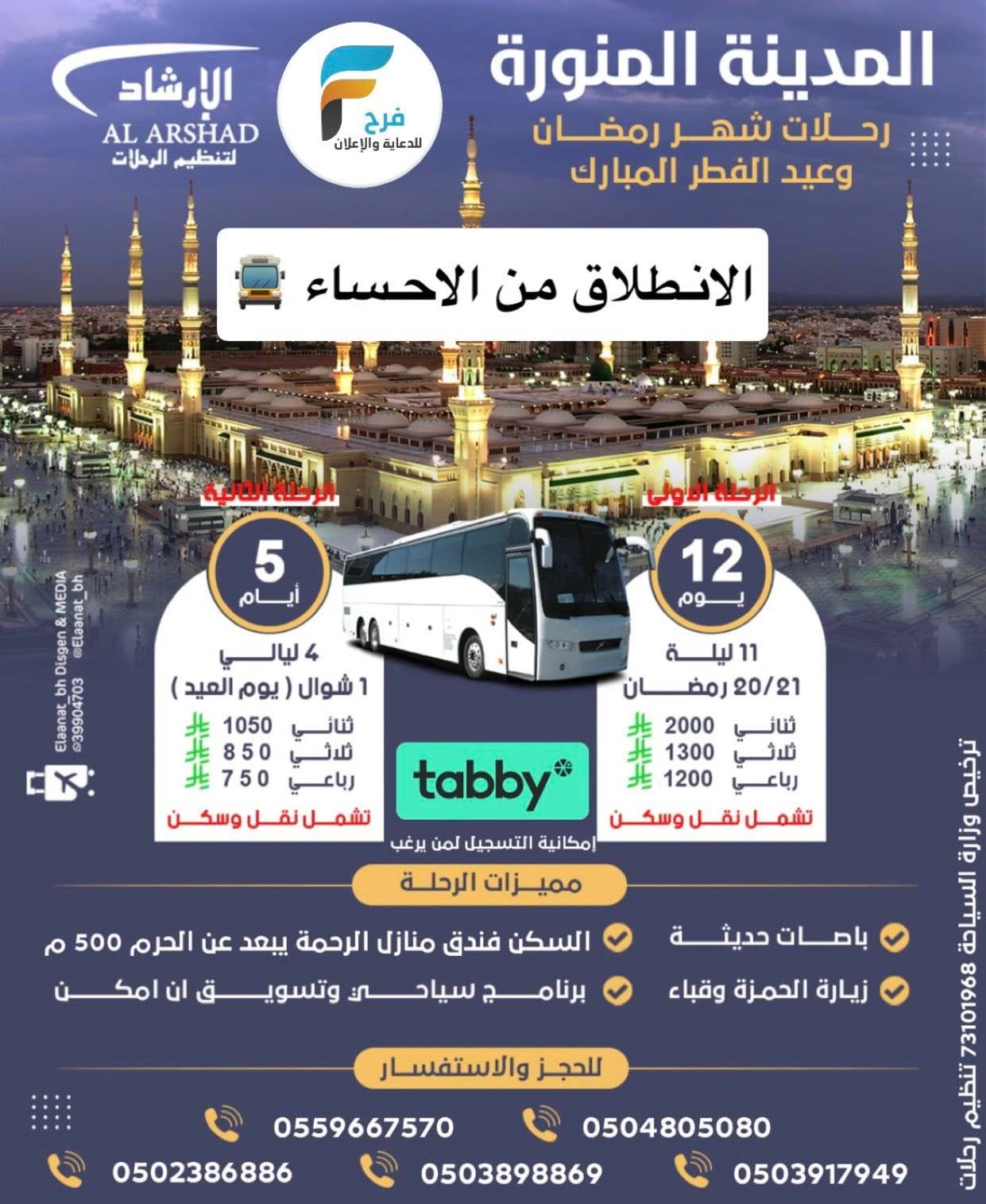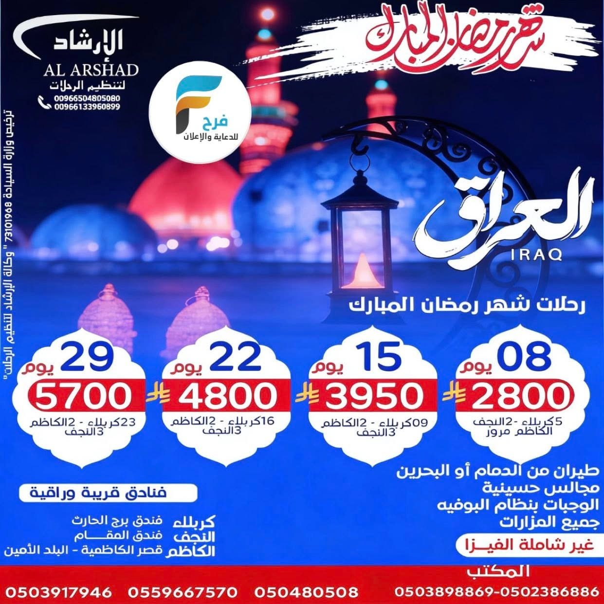750 ريال تبدأ رحلات وكالة الارشاد شهر رمضان / المدينة المنورة – العراق 22 فبراير، 2026 325/12/20للحجز والاستفسار:حجي الحمدان ابو أحمد0504805080المكتب0135960899الدمام / القطيف05596675700502386886050389886905031153360503917946أشترك معنا في خدمة فرح :