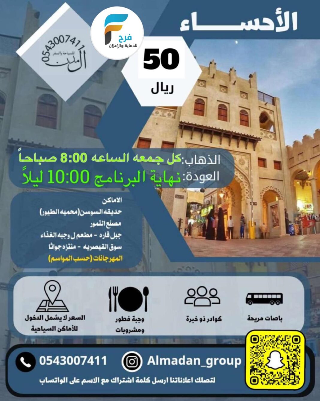 50 ريال تبدأ رحلات حملة آل مدن / الاحساء – الرياض – قطر – الكويت – العمرة الرجبية 4 فبراير، 2024 5 للحجز و الاستفسار : 0543007411 سناب :https://www.snapchat.com أشترك معنا في خدمة فرح : Enter the text or HTML code here شارك هذا الموضوع: النقر للمشاركة على X (فتح في نافذة جديدة) X انقر للمشاركة على فيسبوك (فتح في نافذة جديدة) فيس بوك معجب بهذه:إعجاب تحميل... مرتبط