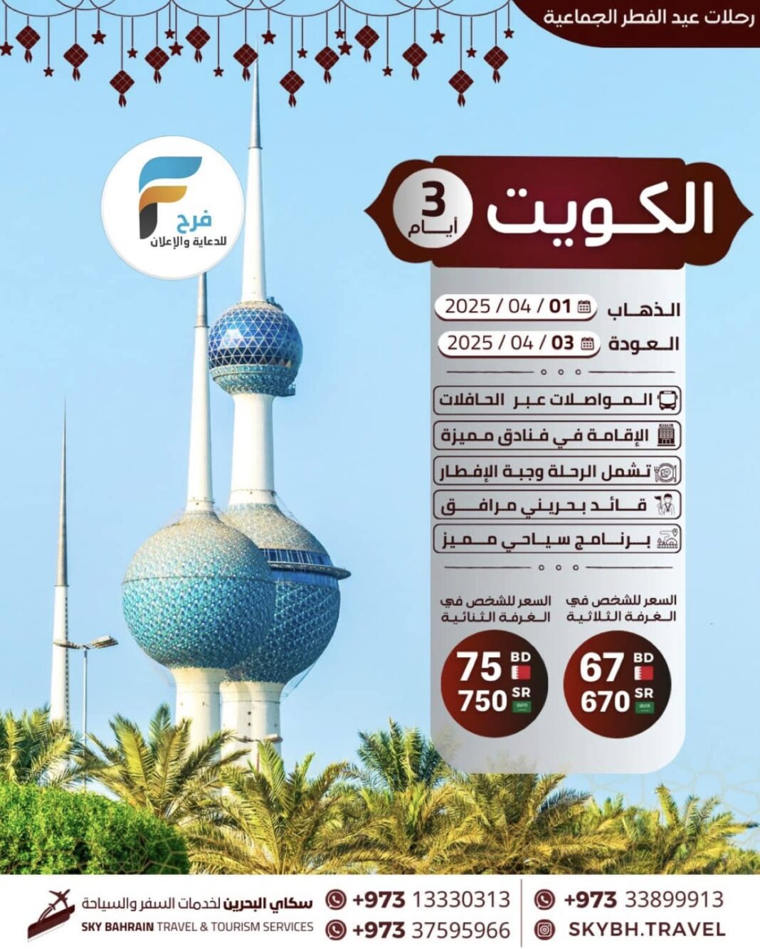 670 ريال تبدأ رحلات سكاي للسفر والسياحة عيد الفطر / الكويت – دبي – العراق – تركيا 16 مارس، 2025 9 للحجز أو الاستفسار : 0097313330313 0097337595966 0097333899913 الانستقرام: www.instagram.com أشترك معنا في خدمة فرح : Enter the text or HTML code here شارك هذا الموضوع: النقر للمشاركة على X (فتح في نافذة جديدة) X انقر للمشاركة على فيسبوك (فتح في نافذة جديدة) فيس بوك معجب بهذه:إعجاب تحميل... مرتبط
