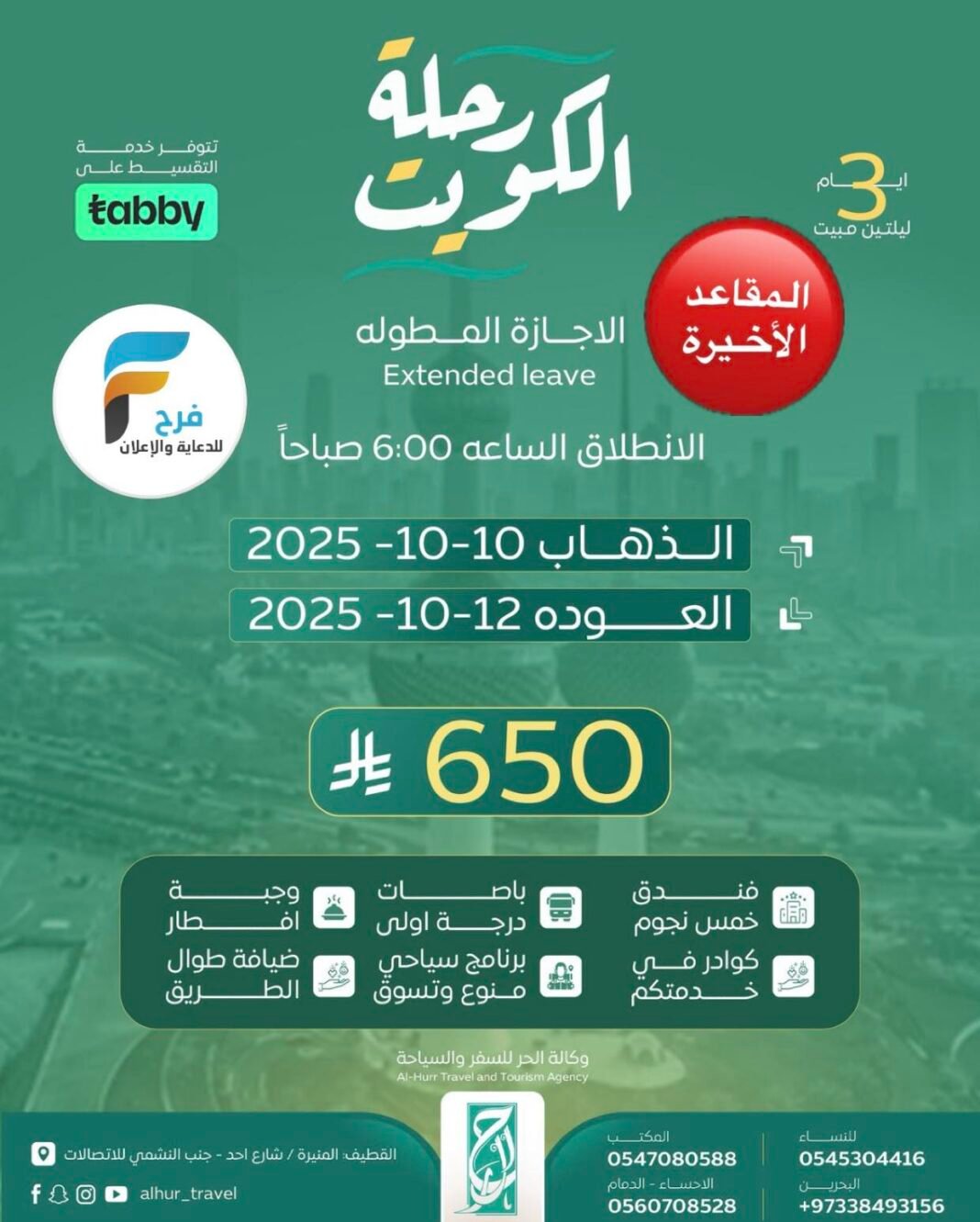 آخر المقاعد رحلة وكالة الحر للسفر والسياحة الإجازة المطولة / الكويت 8 أكتوبر، 20258 25/10/01للحجز أو الاستفسار :0547080588054530441605607085280097338493156انستغرام : www.instgram.comسناب : www.snapchat.comأشترك معنا في خدمة فرح :