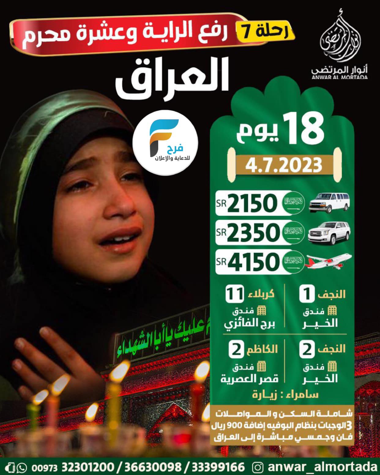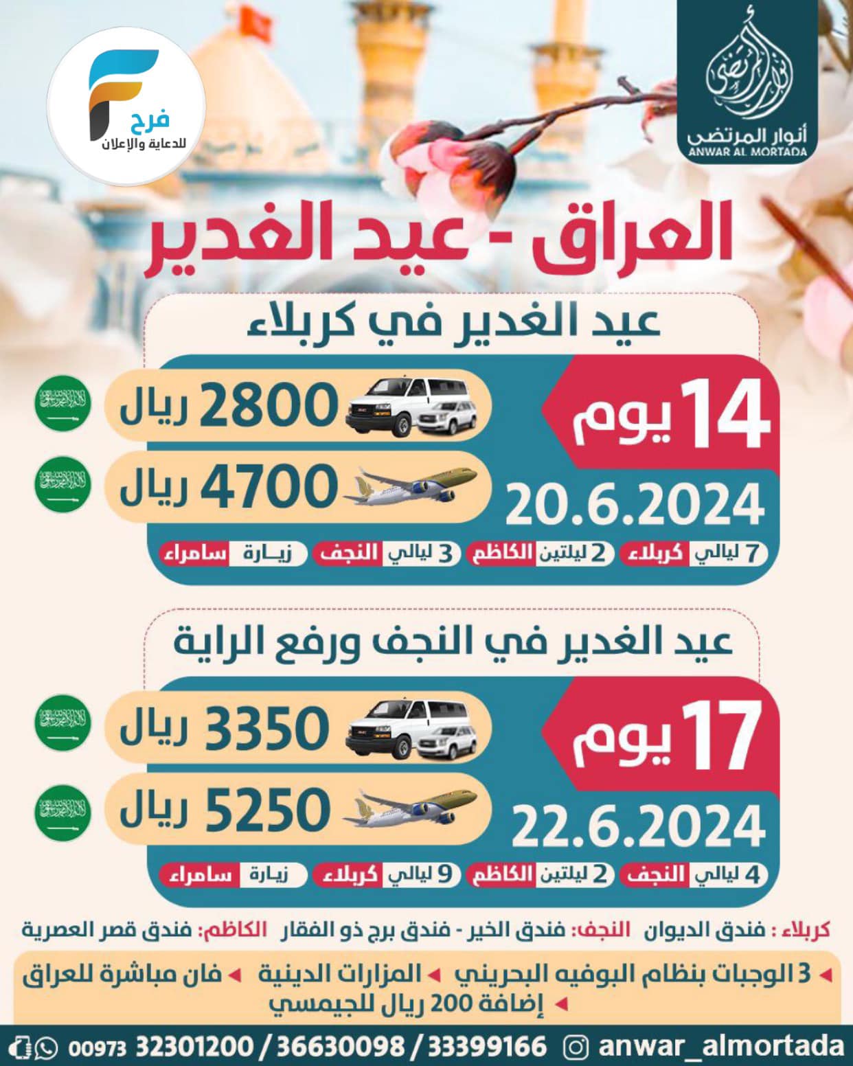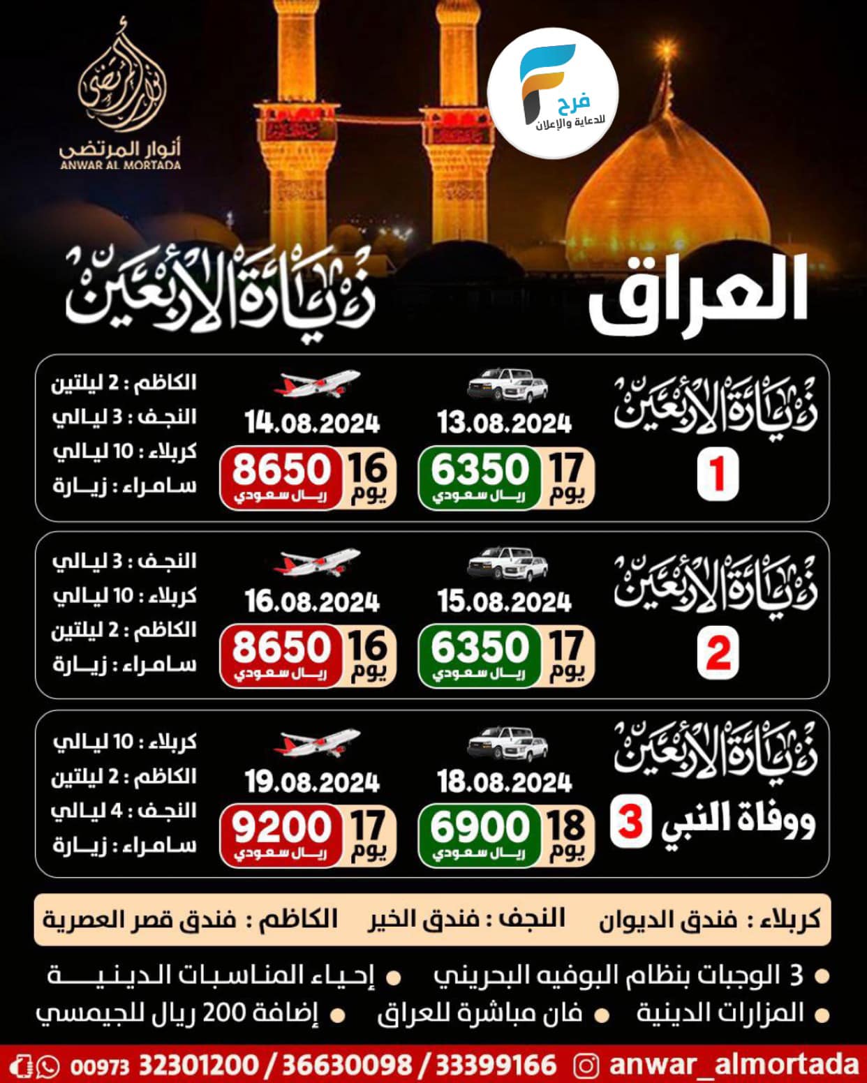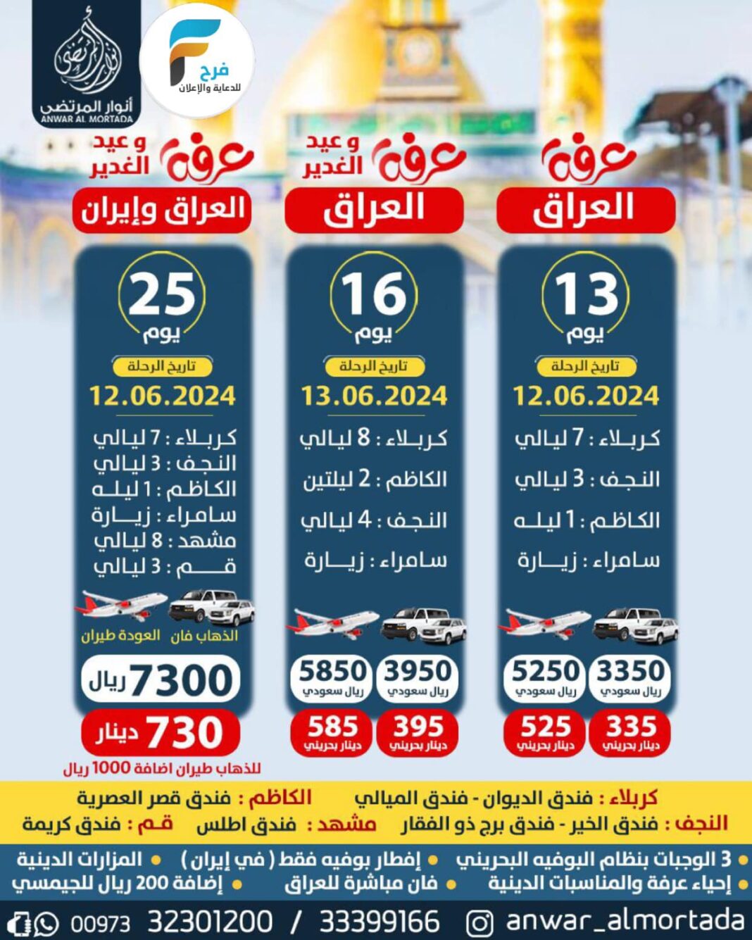 2150 ريال تبدأ رحلات الحافلات والطيران انوار المرتضى عرفة والغدير ورفع الراية وعشرة محرم / العراق 4 يونيو، 2024 1له 1 للحجز و الاستفسار : 0097332301200 0097336630098 0097333399166 : الانستقرام https://www.instagram.com/ أشترك معنا في خدمة فرح : Enter the text or HTML code here شارك هذا الموضوع: النقر للمشاركة على X (فتح في نافذة جديدة) X انقر للمشاركة على فيسبوك (فتح في نافذة جديدة) فيس بوك معجب بهذه:إعجاب تحميل... مرتبط