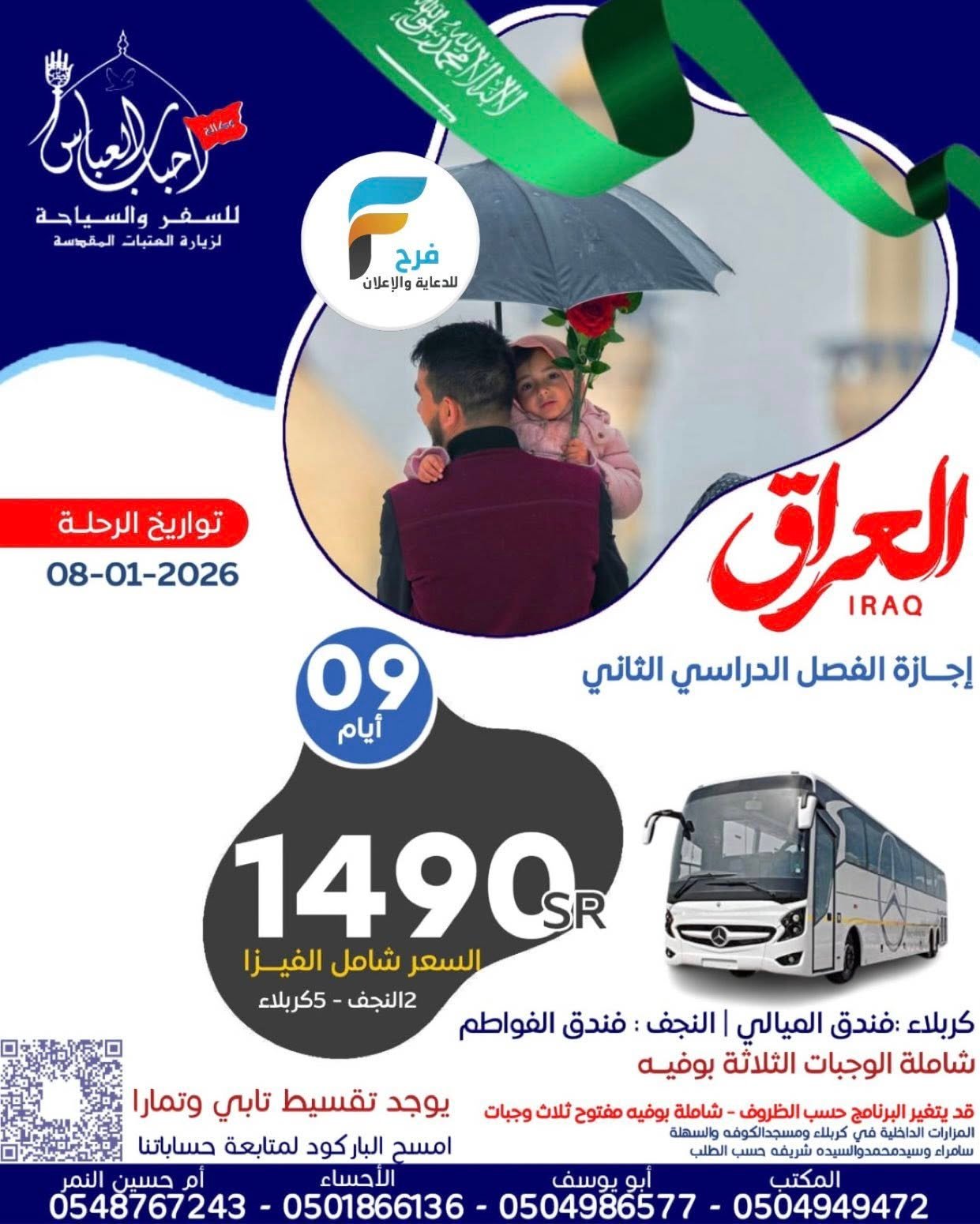 الرئيسية العراق 1490 ريال تبدأ رحلات الحافلات والطيران وكالة احباب العباس / العراق