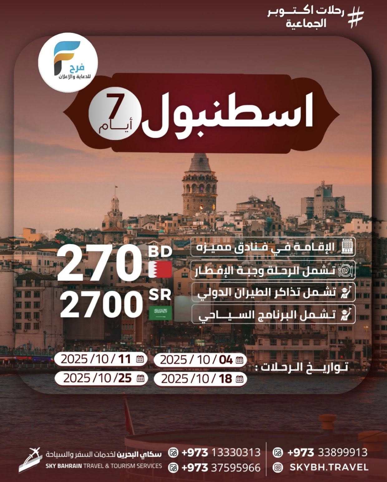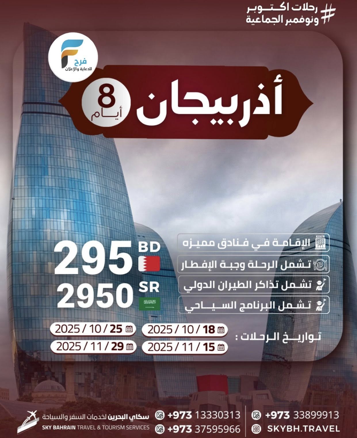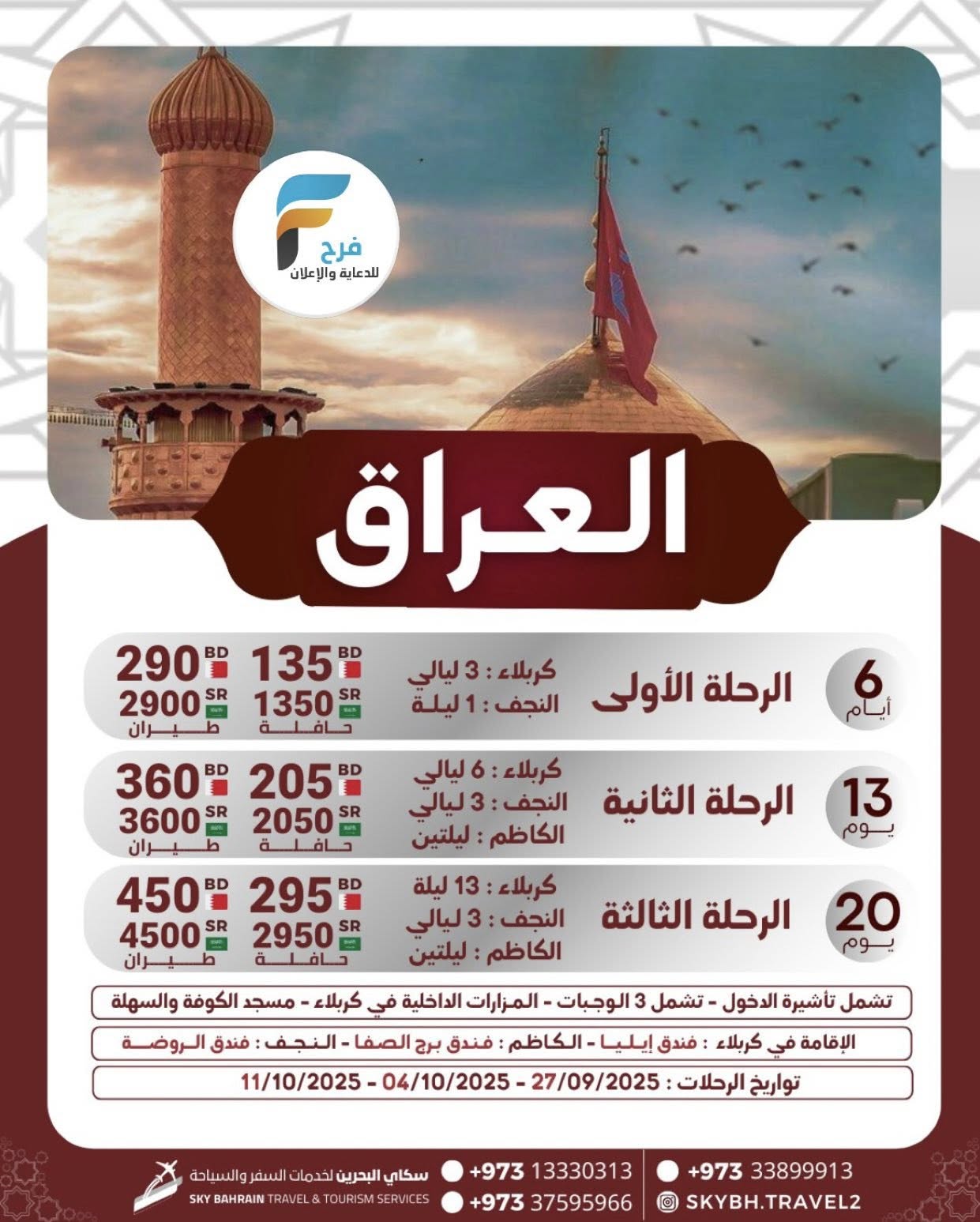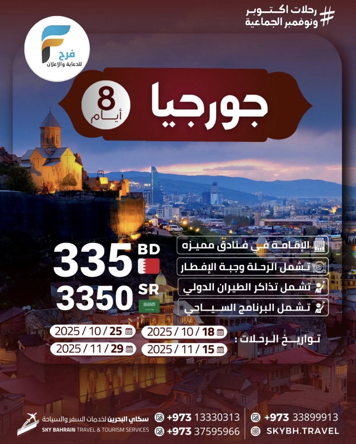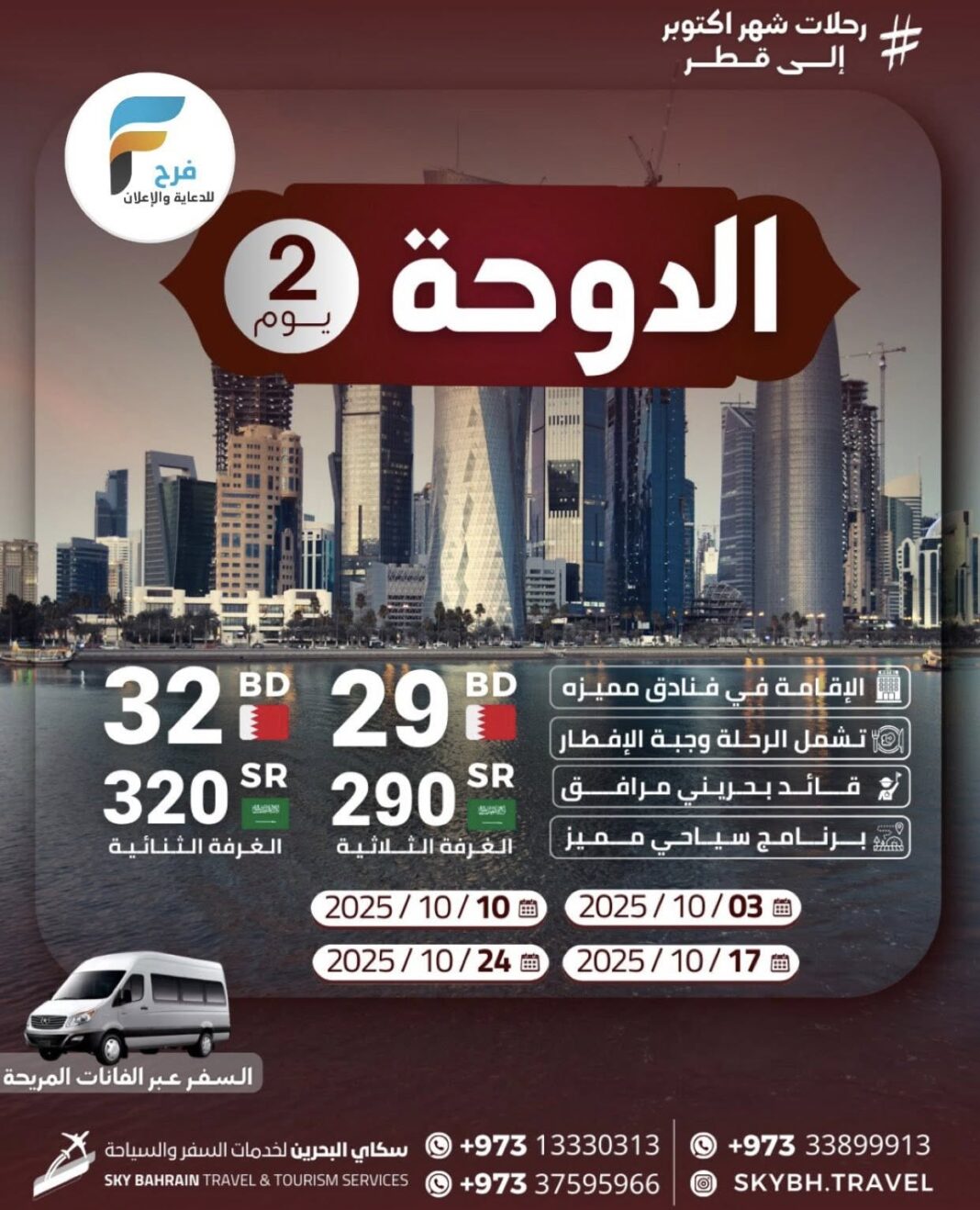 290 ريال تبدأ رحلات سكاي شهر اكتوبر / قطر – العراق – اذربيجان – تركيا – جورجيا 30 سبتمبر، 2025 6 للحجز أو الاستفسار : 0097313330313 0097337595966 0097333899913 الانستقرام: www.instagram.com أشترك معنا في خدمة فرح : Enter the text or HTML code here شارك هذا الموضوع: النقر للمشاركة على X (فتح في نافذة جديدة) X انقر للمشاركة على فيسبوك (فتح في نافذة جديدة) فيس بوك معجب بهذه:إعجاب تحميل... مرتبط