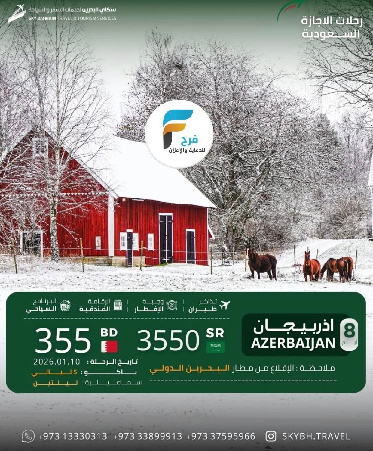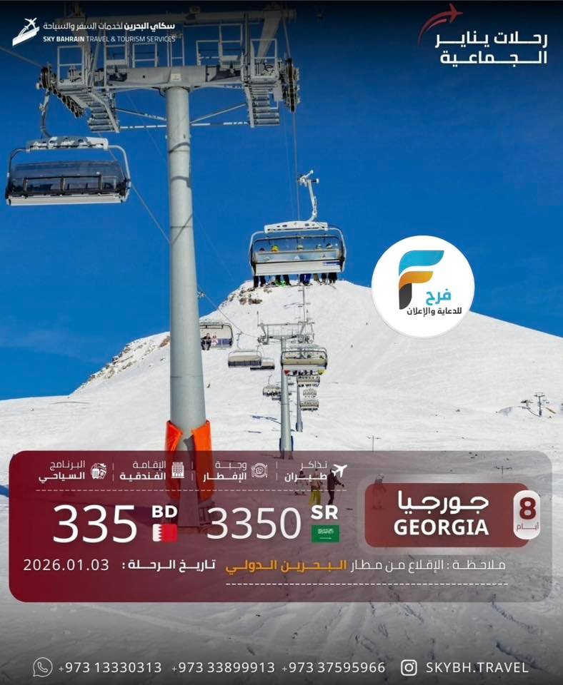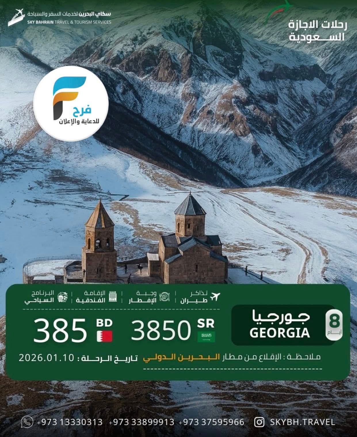 550 ريال تبدأ رحلات سكاي / قطر – جورجيا – اذربيجان 22 ديسمبر، 20253للحجز أو الاستفسار :009731333031300973338999130097337595966الانستقرام:www.instagram.comأشترك معنا في خدمة فرح :