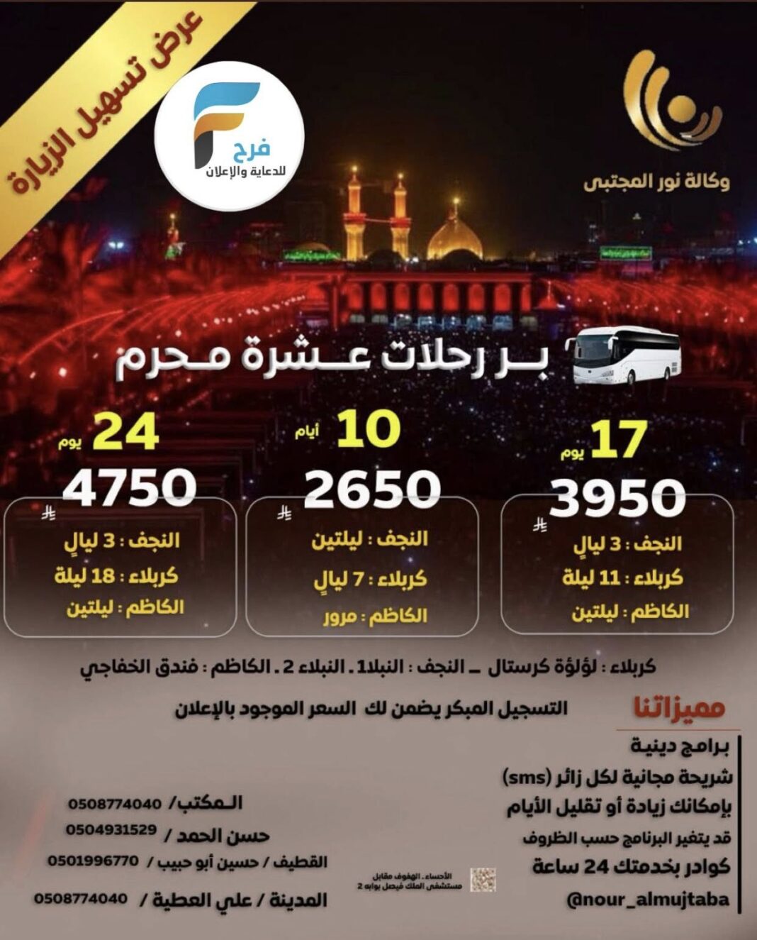 2650 ريال رحلات وكالة نور المجتبى عشرة محرم وإعادة العشرة / العراق 26 يونيو، 2025 3 للحجز و الإستفسار : 0508774040 0504931529 0542849666 0501996770 0509774040 حسابات السوشل ميديا Nour_Almujtaba أشترك معنا في خدمة فرح : Enter the text or HTML code here شارك هذا الموضوع: النقر للمشاركة على X (فتح في نافذة جديدة) X انقر للمشاركة على فيسبوك (فتح في نافذة جديدة) فيس بوك معجب بهذه:إعجاب تحميل... مرتبط