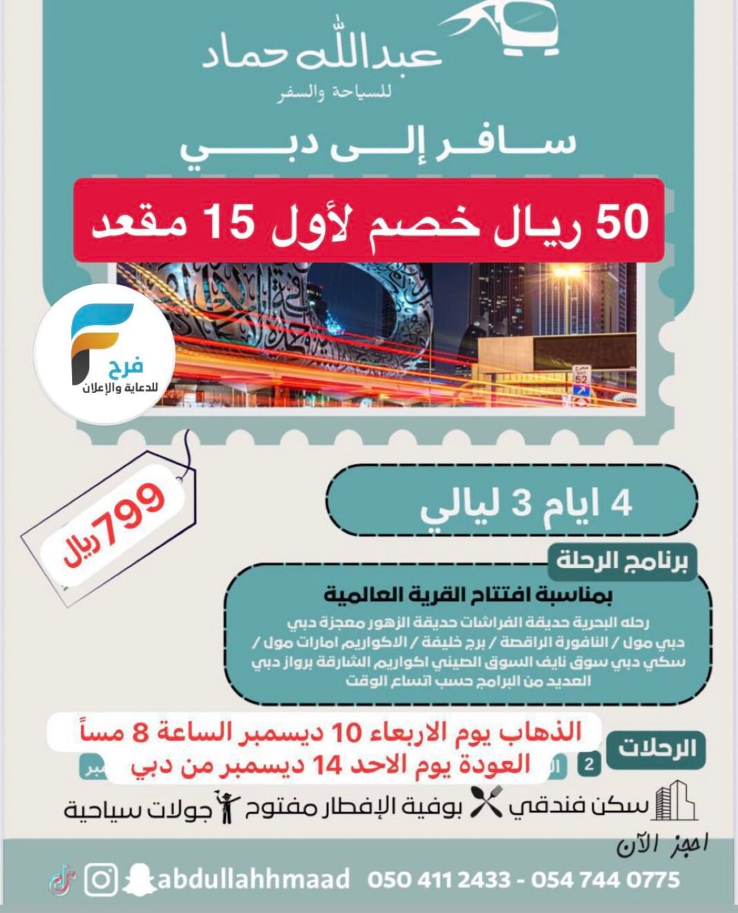 50 ريال خصم لأول 15 مقعد رحلة وكالة عبدالله حماد / دبي 3 ديسمبر، 2025 للحجز و الاستفسار :عبدالله حماد: 0504112433للنساء: 0547440775تاروت سيد حسين : 0501919816: سناب شاتhttps://www.snapchat.com : الانستقرامhttps://www.instagram.comأشترك معنا في خدمة فرح :