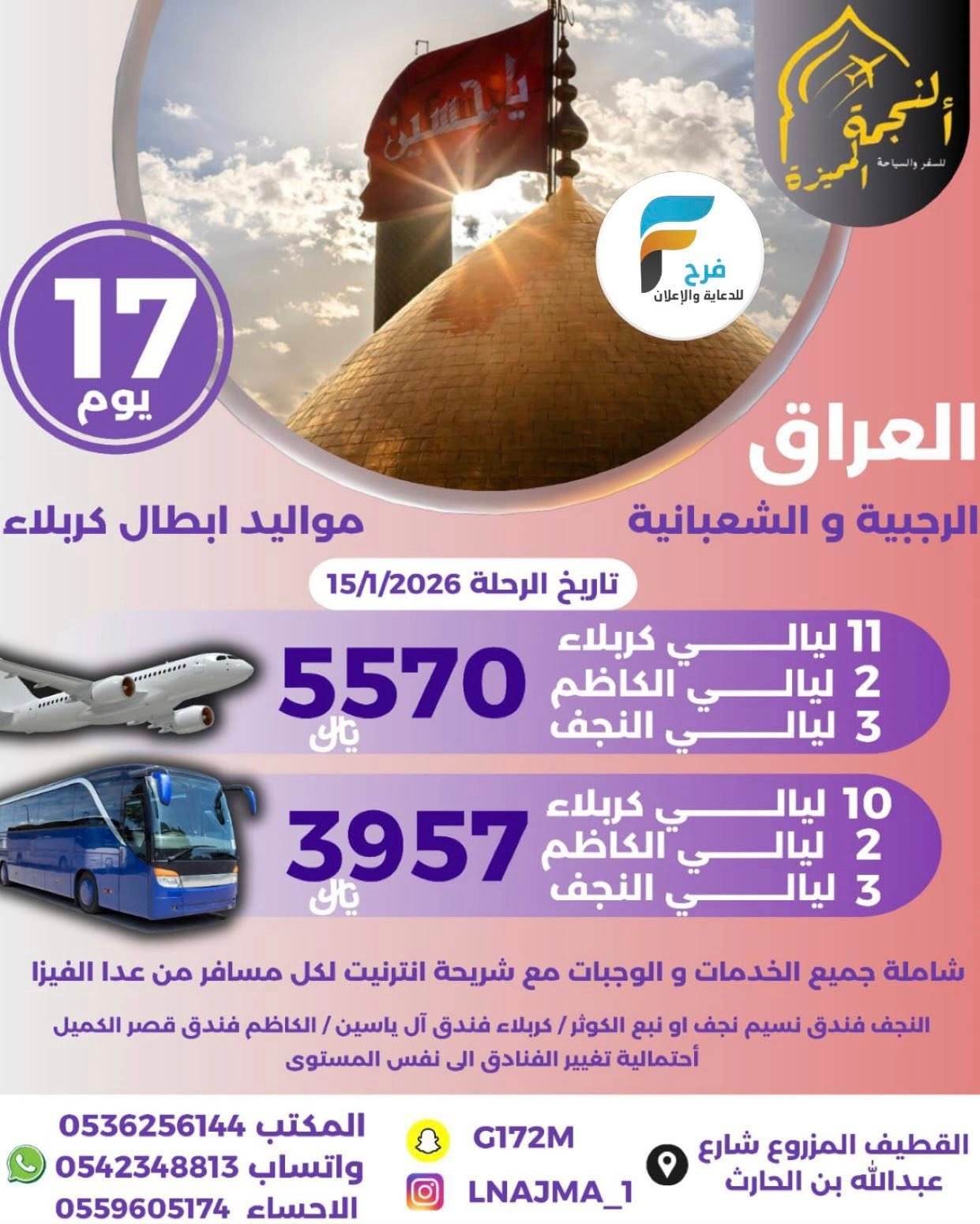 415 ريال تبدأ رحلات الحافلات والطيران وكالة النجمة المميزة إجازة منتصف العام / العمرة الرجبية – العراق 15 ديسمبر، 2025 525/12/15 للحجز والاستفسار : 0536256144 0542348813 0559605174 الإنستقرام :www.instagram.com سناب شات :www.snapchat.com أشترك معنا في خدمة فرح : شارك هذا الموضوع: النقر للمشاركة على X (فتح في نافذة جديدة) X انقر للمشاركة على فيسبوك (فتح في نافذة جديدة) فيس بوك معجب بهذه:إعجاب تحميل... مرتبط