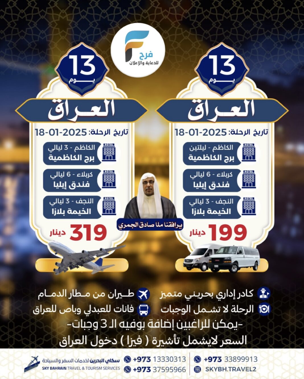 1990 ريال تبدأ رحلات الفانات والطيران سكاي للسفر والسياحة / العراق 6 يناير، 2025 10 للحجز أو الاستفسار : 0097313330313 0097337595966 0097333899913 الانستقرام: www.instagram.com أشترك معنا في خدمة فرح : Enter the text or HTML code here شارك هذا الموضوع: النقر للمشاركة على X (فتح في نافذة جديدة) X انقر للمشاركة على فيسبوك (فتح في نافذة جديدة) فيس بوك معجب بهذه:إعجاب تحميل... مرتبط