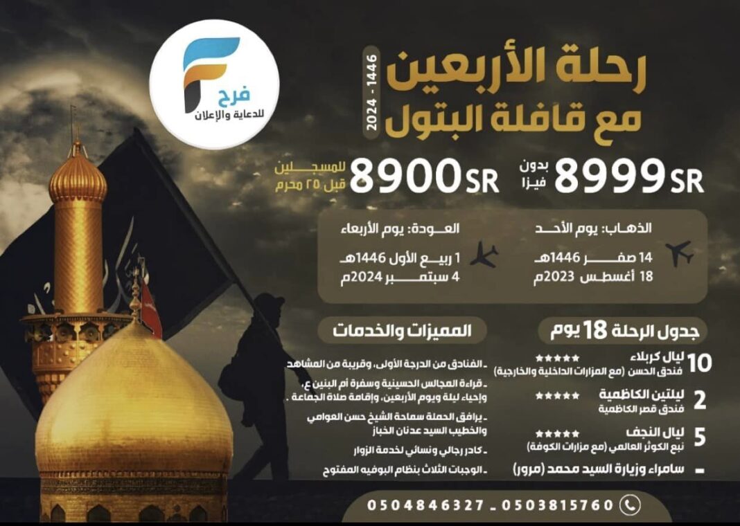 رحلة قافلة البتول زيارة الأربعين / العراق 14 يوليو، 2024 2 للحجز أو الاستفسار : 0503815760 0504846327 للنساء0509085963 0500680990 أشترك معنا في خدمة فرح : Enter the text or HTML code here شارك هذا الموضوع: النقر للمشاركة على X (فتح في نافذة جديدة) X انقر للمشاركة على فيسبوك (فتح في نافذة جديدة) فيس بوك معجب بهذه:إعجاب تحميل... مرتبط
