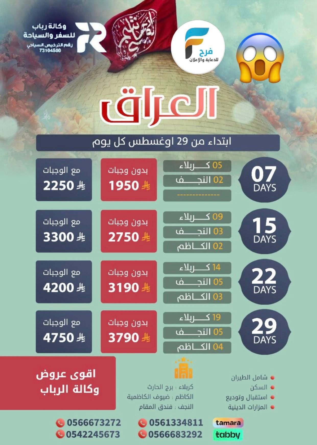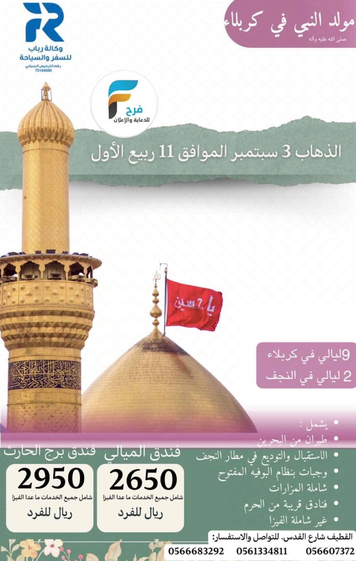 1950 ريال تبدأ رحلات وكالة رباب للسفر والسياحة مولد النبي ص / العراق 20 أغسطس، 2025 1ب ق 500للحجز والإستفسار :0542245673056667327205613348110566683292انستقرام www.instagram.comسناب شاتwww.snapchat.comأشترك معنا في خدمة فرح :
