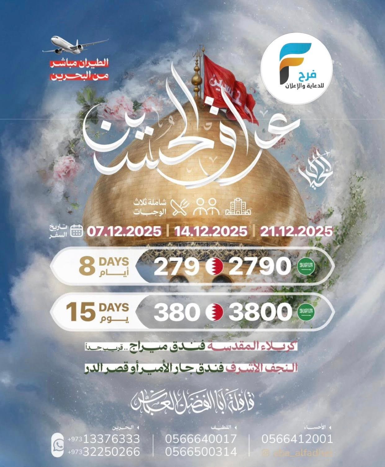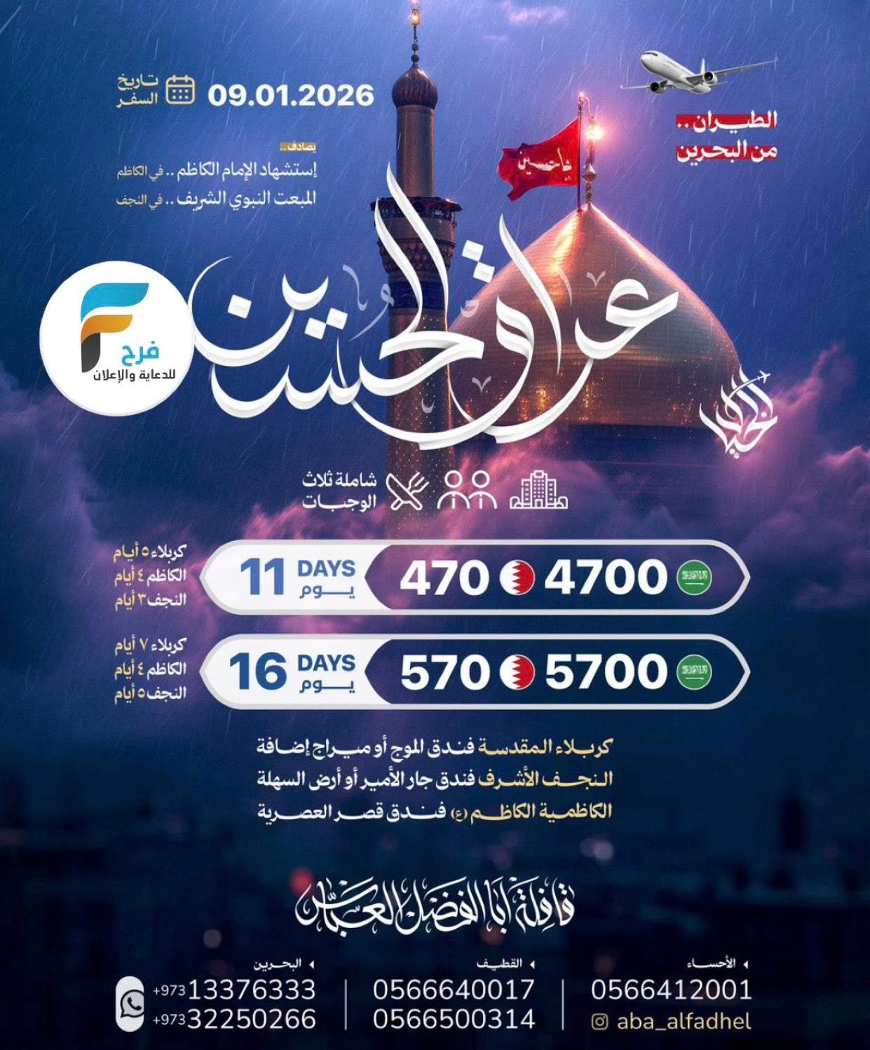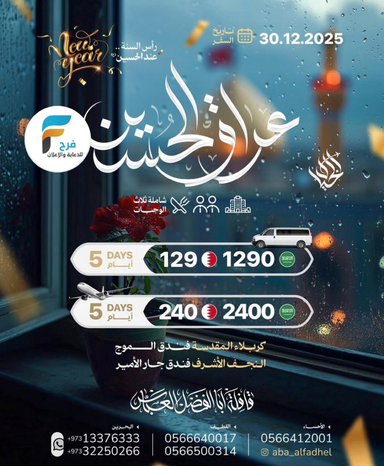 1290 ريال تبدأ رحلات الحافلات والطيران قافلة ابا الفضل العباس / العراق 7 ديسمبر، 2025 1025/12/09 للحجز أو الاستفسار : القطيف: 0558335297 0566500314 0566640017 0544696477 0566285623 الاحساء: 0566412001 0501908993 البحرين:0097313376333 0097332250266 انستغرام : Aba_alfadhel فيس بوك / قافلة ابا الفضل العباس سناب / https://www.snapchat.com أشترك معنا في خدمة فرح : شارك هذا الموضوع: النقر للمشاركة على X (فتح في نافذة جديدة) X انقر للمشاركة على فيسبوك (فتح في نافذة جديدة) فيس بوك معجب بهذه:إعجاب تحميل... مرتبط
