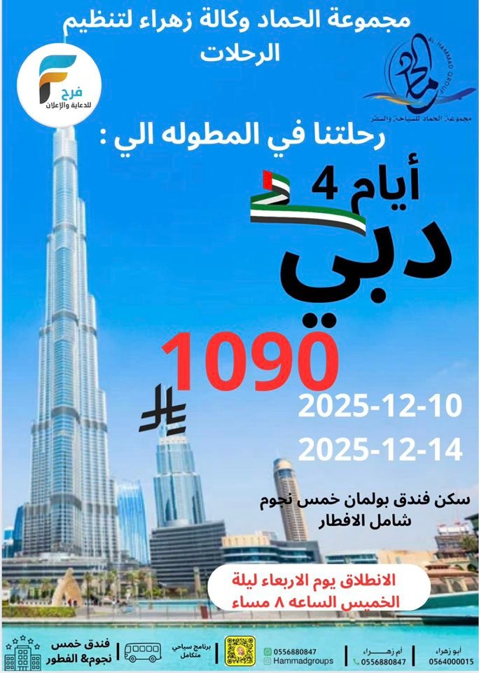790 ريال رحلات مجموعة الحماد الإجازة المطولة / الكويت – دبي 3 ديسمبر، 2025 725/09/09 للاستفسار والحجز واتساب : 0556880847 أو الإتصال على الأرقام التالية: محمد أبو زهراء: 0509486700 أو 0564000015 أم زهراء: 0556880847 0547188291 للمتابعة على برامج التواصل سناب شات: Hammadgroups انستقرام: Hammadgroups 💐 لطفا التكرم بنشر اﻹعلان .. أشترك معنا في خدمة فرح : شارك هذا الموضوع: النقر للمشاركة على X (فتح في نافذة جديدة) X انقر للمشاركة على فيسبوك (فتح في نافذة جديدة) فيس بوك معجب بهذه:إعجاب تحميل... مرتبط