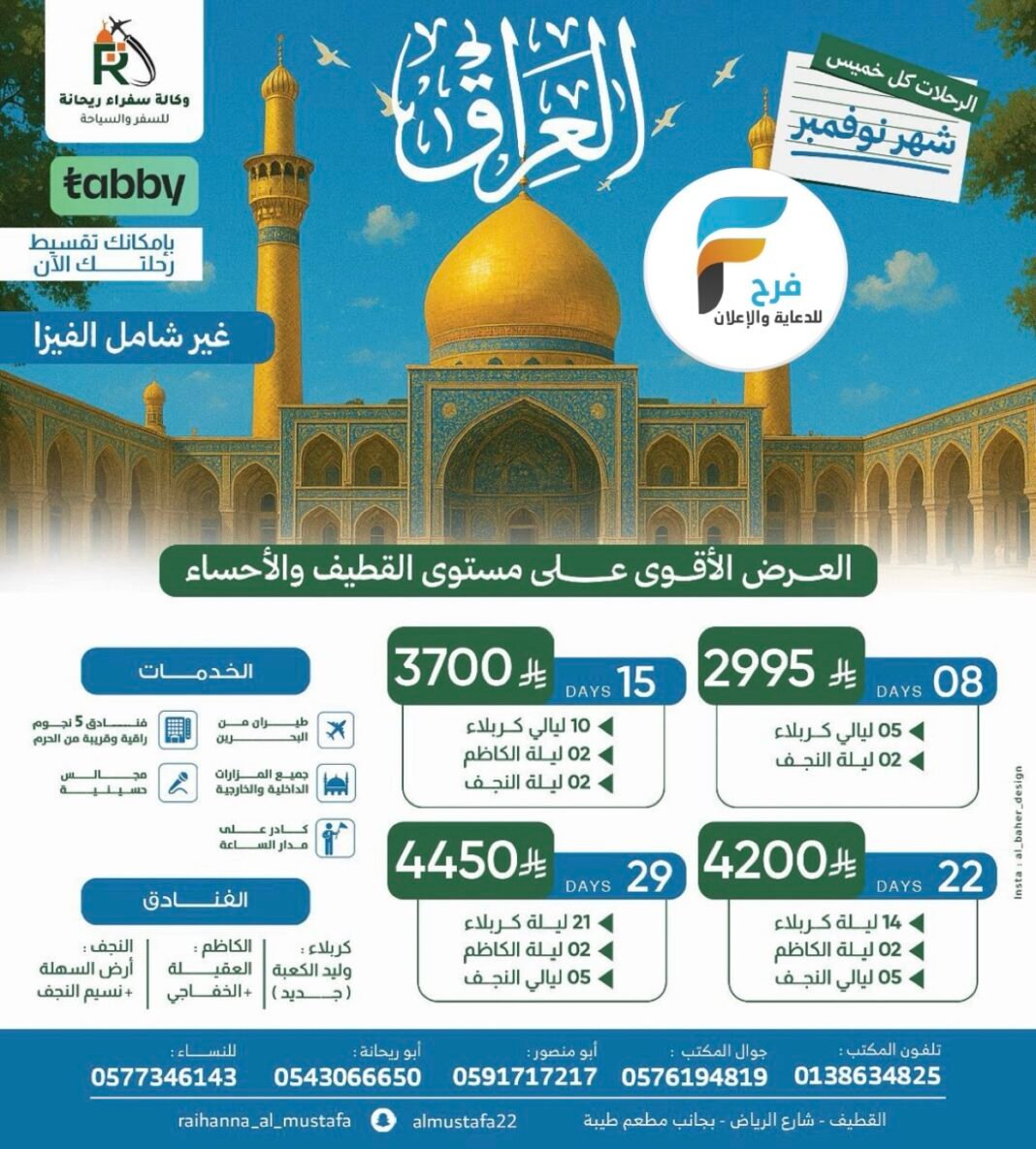 رحلات وكالة سفراء ريحانة / العراق – المدينة المنورة 26 أكتوبر، 2025 425/09/10📞للحجزوالإستفسار 📞📱ابو منصور 0591717217📱أبو ريحانة0543066650☎تلفون المكتب057619481905939870300138634825📱للنساء فقط0577346143⬅لتصلكم عروضنا أحفظ الرقم وأرسل كلمة إشتراك مع الإسم📲0543066650أو على انستغرام القافلةhttps://instagram.comسناب القافلة:almustafa22www.snapchat.comـ₰✍~✿❁࿐❁✿~الفرع الجديد القطيف الشويكة شارع الرياض بجانب مطعم طيبة📍اللوكيشن :-https://maps.app.goo.glأشترك معنا في خدمة فرح :
