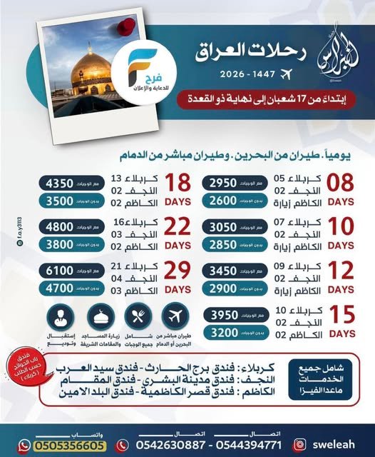 2600 ريال تبدأ رحلات حملة النبراس / العراق 26 يناير، 2026 لم 2 للحجز أو الاستفسار :- 0542630887 0505356605 0544394771 المكتب :- 0138551711 الانستقرام : https://www.instagram.com/ أشترك معنا في خدمة فرح :