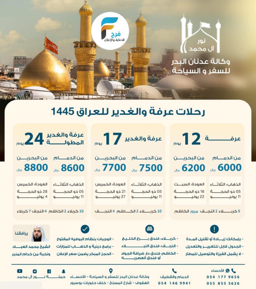 5200 ريال تبدأ رحلات حملة نور آل محمد عرفة والغدير وعاشوراء الحسين / العراق 18 مايو، 2024 3 للحجز والاستفسار : الاحساء 0558555626 0541779656 القطيف والدمام 0541469941 الانستقرام :www.instagram.com أشترك معنا في خدمة فرح : Enter the text or HTML code here شارك هذا الموضوع: النقر للمشاركة على X (فتح في نافذة جديدة) X انقر للمشاركة على فيسبوك (فتح في نافذة جديدة) فيس بوك معجب بهذه:إعجاب تحميل... مرتبط